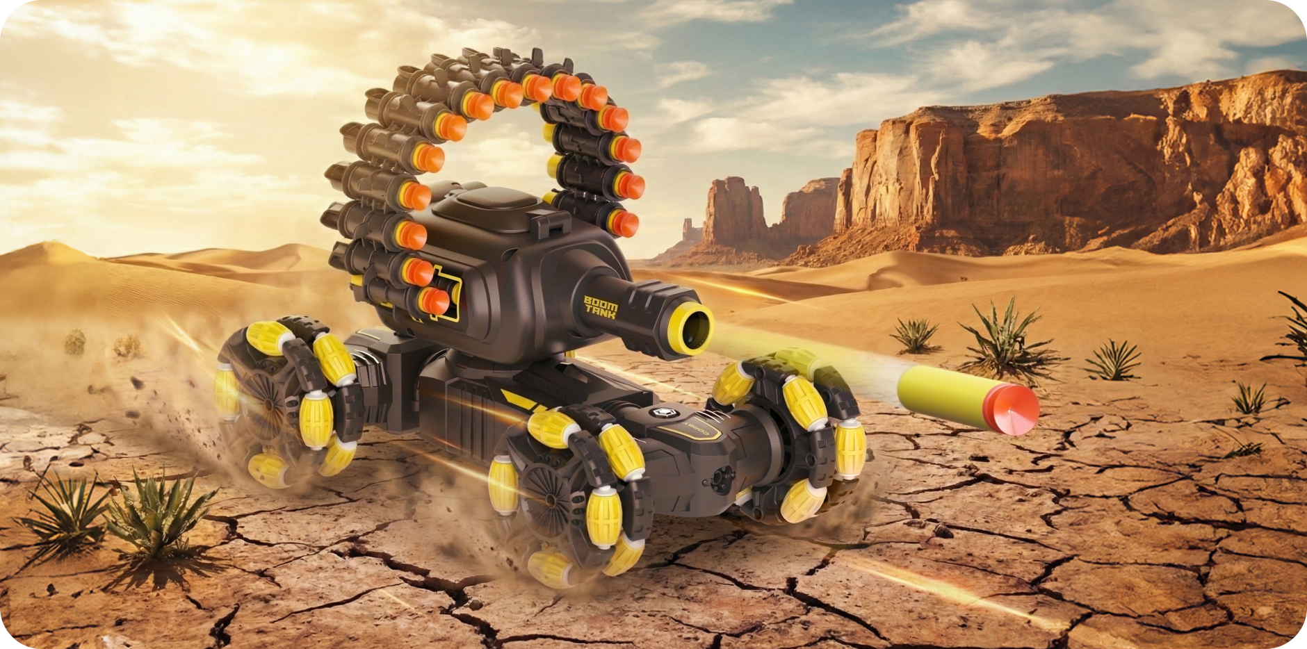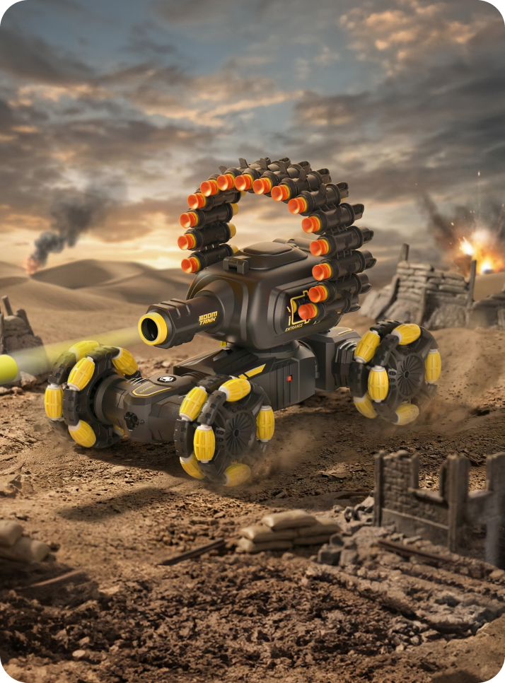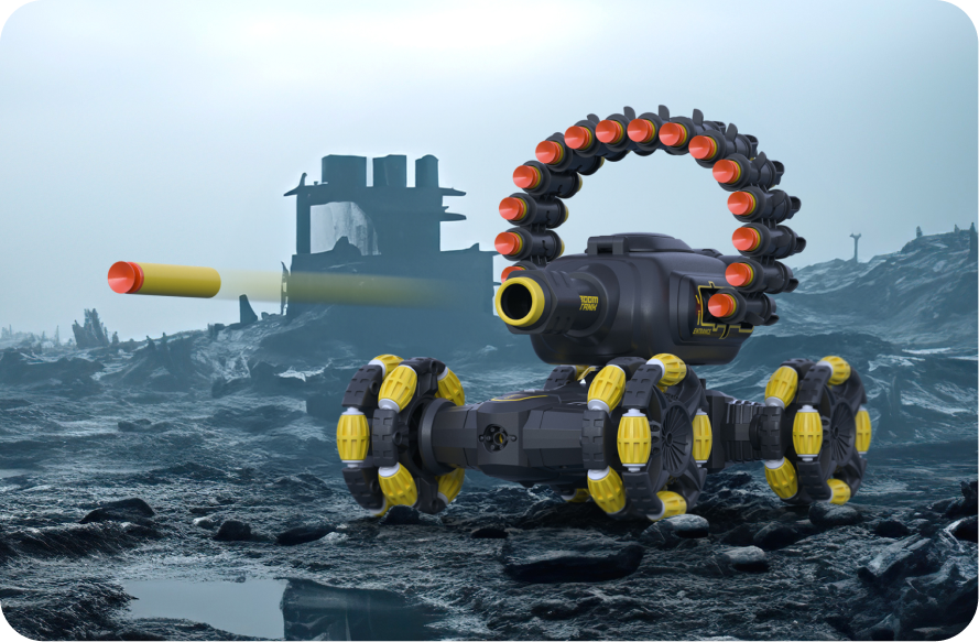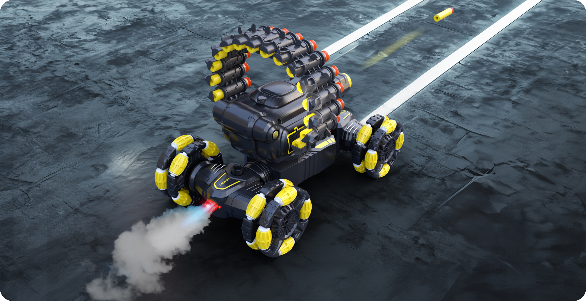 360° dönebilen güçlü tekerlekleri, mermi atışı ve gerçek buhar püskürtmeyle